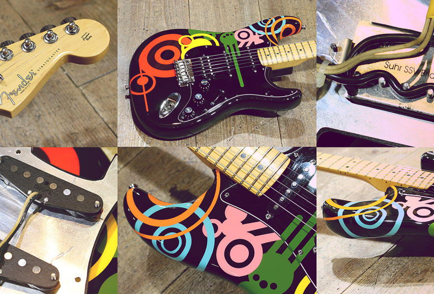 何とも謎が深いモデルです。FenderのアメリカンスタンダードHSSストラトキャスターにペイントが施されています。SCANDALでギター(ボーカル)を務めるMAMI氏が所有するカスタムペイントの一本を忠実に再現しています。カッティングシートではなくキレイに塗装されており、素人工作ではなさそうです。本人のストラトはフェンダーではなく塗装屋さんにペイントしてもらったそうですが著作権の関係か、注文は受け付けていない模様。